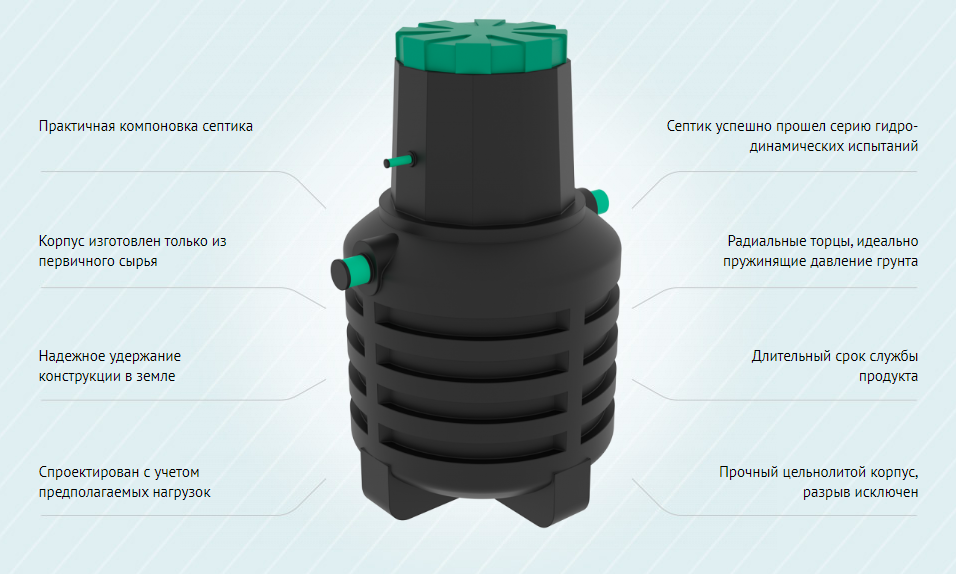- Корпус септика изготовлен из прочного материала, который не ржавеет, не разрушается под действием температур и имеет большую химическую стойкость и поэтому служит более 50 лет